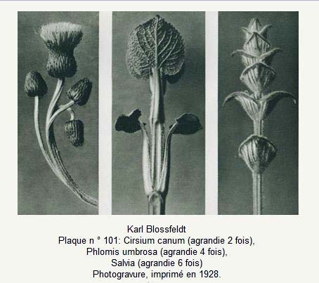 Karl Blossfeldt, naît en 1865, en Allemagne. Il étudie la sculpture puis les arts appliqués. Autodidacte en photographie, il se consacre dès les années 1890 à l'étude de la nature (rameaux d'érable, crosses de fougère, calices de fleurs, bourgeons, épis...) pour constituer une documentation ornementale ; sa chambre photographique lui permet de réaliser des macrophotographies, grossissant le sujet jusqu'à plus de trente fois sa taille réelle. Ses photographies épurées de détails de végétaux en gros plan (plante non photographiée dans sa totalité ni in situ) se détachent sur un fond neutre et composent un herbier où chacune des plantes est accompagnée de son nom en latin.
